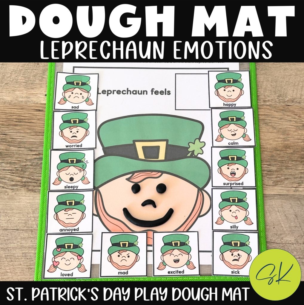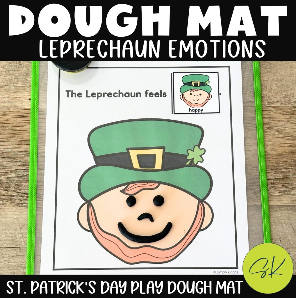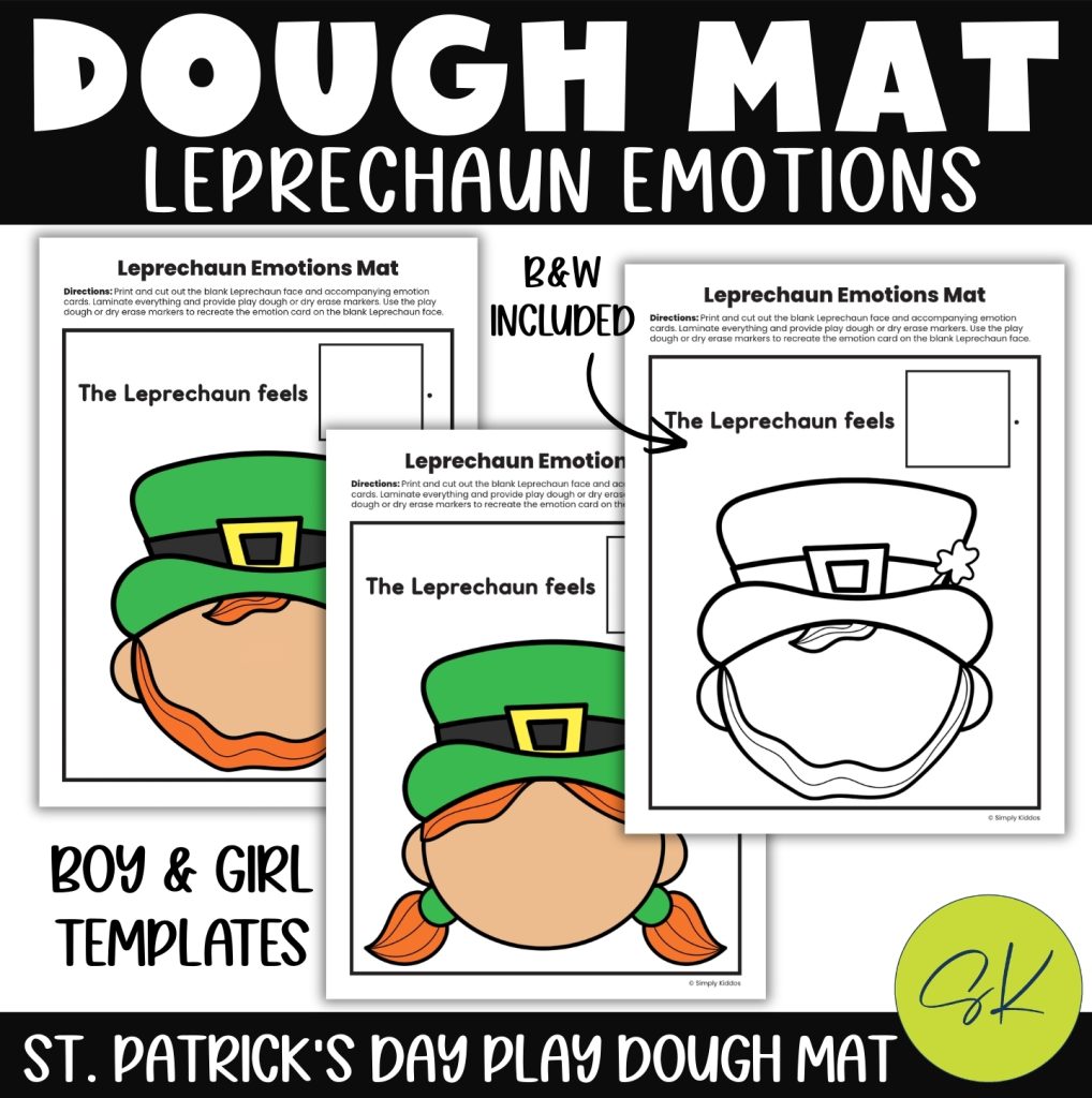 With this St. Patrick’s Day emotion play dough mat activity, different emotions are explored in a fun, hands-on way. Children will be using play dough or dry erase markers to recreate the leprechaun emotion cards on the blank leprechaun.